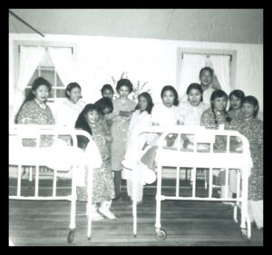 A group of young patients at Clearwater Lake Indian Hospital in 1964. This building was not intended for long-term use, leading to many structural issues. Image source: